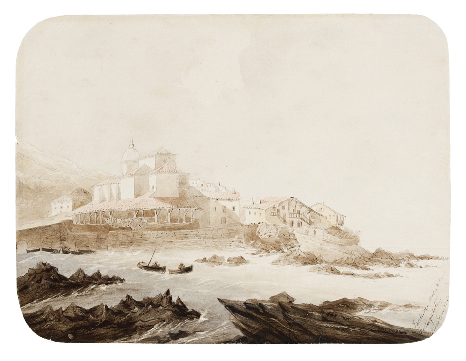 Vista urbana na que, no bordo dun cantil, aparece unha igrexa con atrio de madeira e arredor construcións típicas do norte. En primeiro plano rochas escarpadas e dúas barcas no mar.