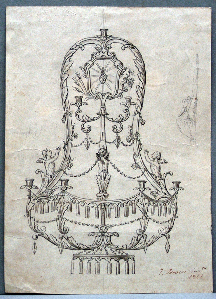 Deseño de lámpada decorada con follas de acanto, talos de parra ondulantes e tres anxos. Na parte superior un Sacro Corazón enmarcado e flanqueado por espigas e un talo de parra. Na parte inferior colgan améndoas en dous rexistros. Lateral dereito: bosquexo a lapis da lámpada.