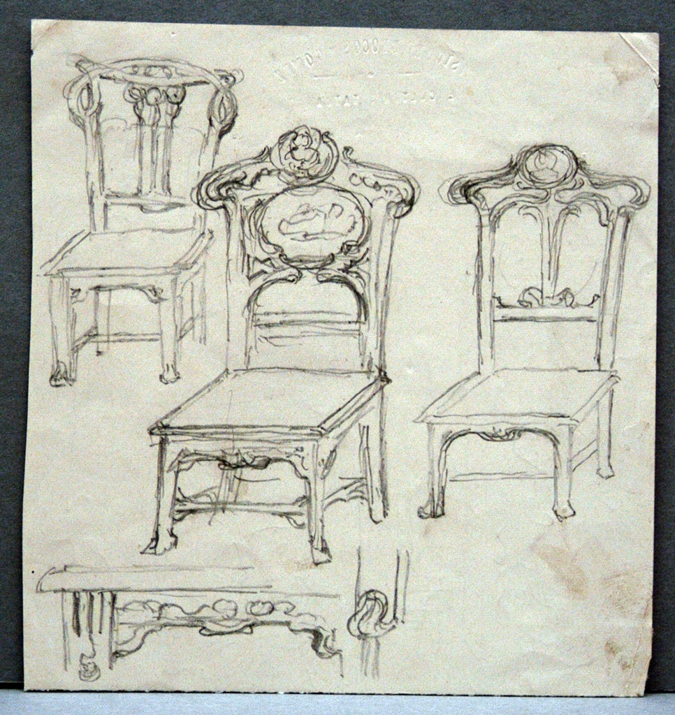 Tres deseños de cadeiras e un de mesa. No reverso: Bosquexos de cabeceiro de cama cunha figura feminina co seu brazo esquerdo na fronte e outros dous, dunha cadeira e dunha mesa.