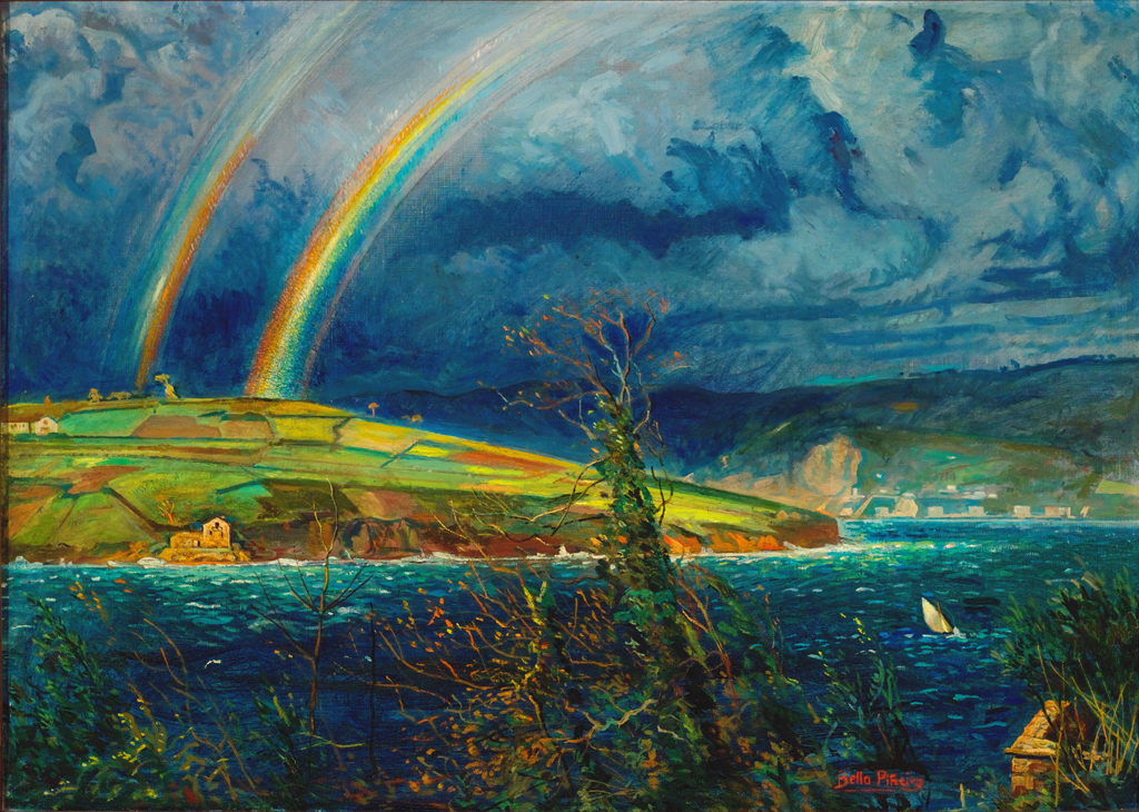 Nun plano intermedio un promontorio de terra métese na ría. Destacan as súas parcelas demarcadas por grosos trazos e resaltadas por unha rica variedade de cores que á súa vez se proxectan no arco da vella. Ao fondo unha montaña, en cuxa ladeira se insinúa un pobo, e a súa cor azulada parece o reflexo dese ceo turbulento e axitado.