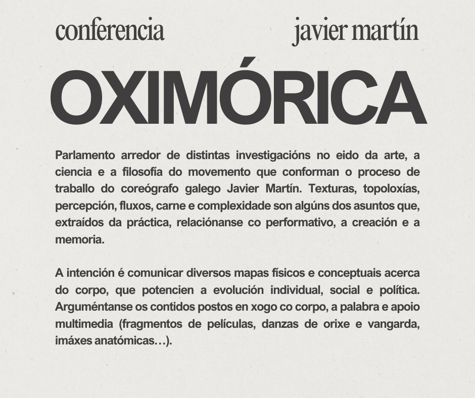 Parlamento arredor de distintas investigacións no eido da arte, a ciencia e a filosofía do movemento que conforman o proceso de traballo do coreógrafo galego Javier Martín. A intención é comunicar diversos mapas físicos e conceptuais acerca do corpo que, extraídos da práctica, relaciónanse co performativo, a creación e a memoria. Arguméntanse os contidos postos en xogo coa palabra, o corpo e apoio multimedia (fragmentos de películas, danzas de orixe e vangarda, imáxes anatómicas…). [duración: 45 mins + debate]