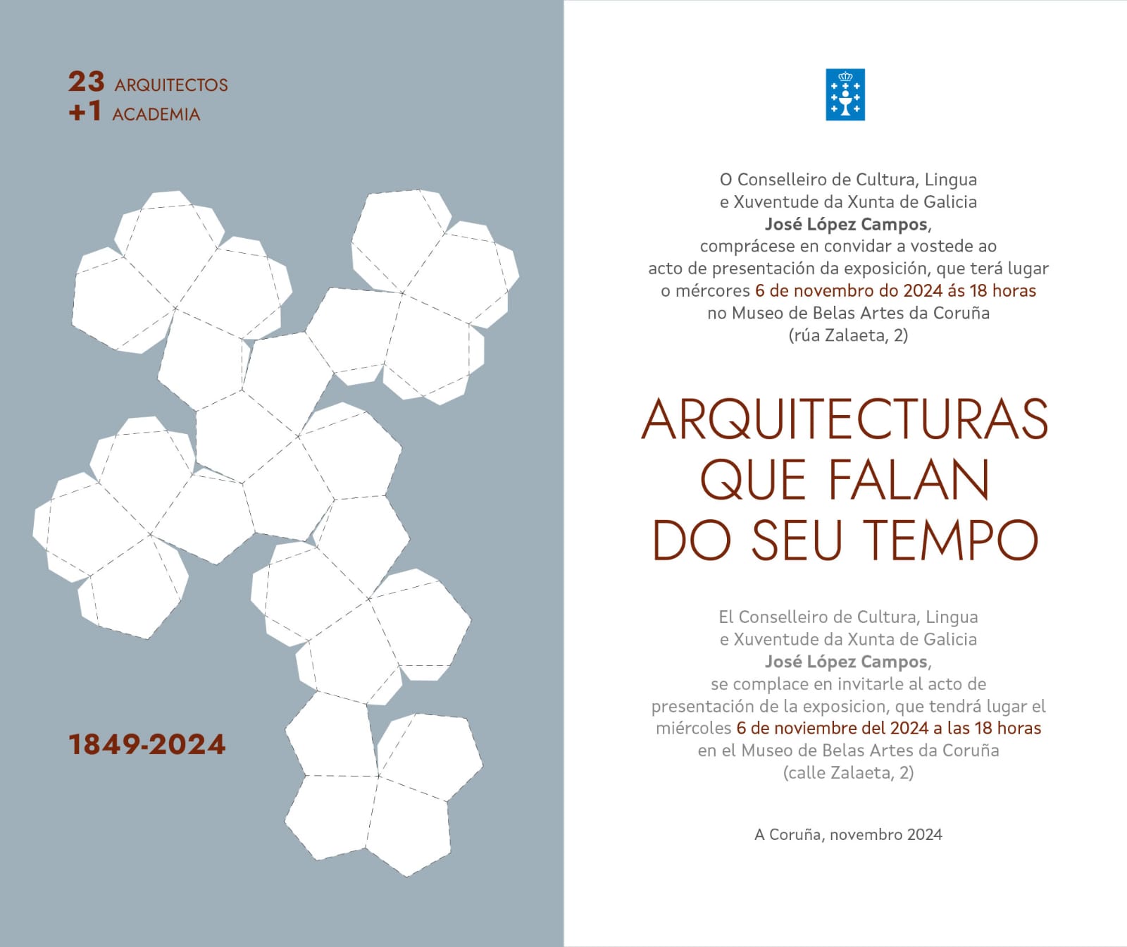 O Museo de Belas Artes da Coruña organiza a exposición comisariada por Xosé Manuel Casabella e Alfredo Sellier, na que se recollen as creacións arquitectónicas dos 23 arquitectos que foron e son académicos de número e de honra da Real Academia Galega de Belas Artes de Nosa Señora do Rosario, desde a súa creación o 31 de outubro de 1849 ata a actualidade.